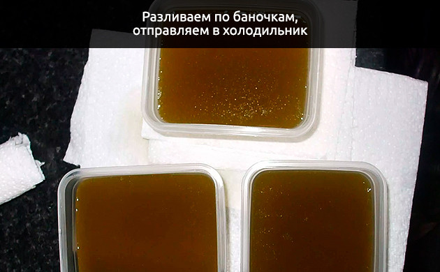 Когда жидкость станет тягучей и густой, добавляем в нее топленое сливочное масло, а также крошим пчелиный воск, все растапливаем и перемешиваем до однородной массы. Следующим кидаем прополис и продолжаем прогревать смесь. В результате на дне должен образоваться темный осадок. Это нормально, таким образом мы избавляемся от ненужных веществ. Продолжаем греть смесь до тех пор, пока она не загустеет или осадок не станет твердым.