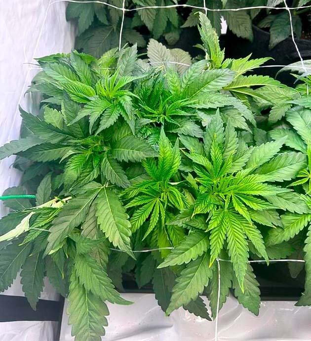 На 23-й день я натянул сетку ScrOG и начал аккуратно заправлять крупные листья вниз, чтобы дать больше света молодым побегам и внутренним точкам роста. Растения гибкие и спокойно принимают нужное положение. По ходу дела выполнил небольшую дефолиацию. Обрезал буквально по паре самых крупных листочков, которые давали много тени.