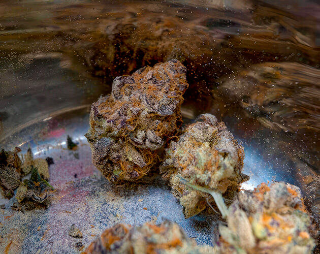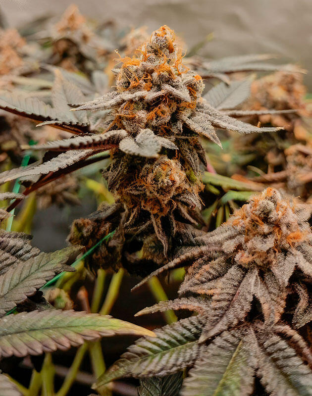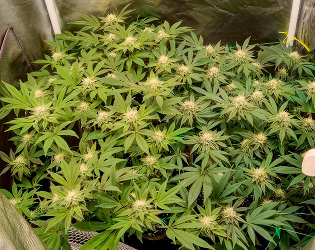 Все идет просто прекрасно. Шишки толстеют, смолы все больше, хотя трихомы пока еще полностью прозрачные. Правый фенотип по-прежнему не очень хорошо переносит интенсивный свет, некоторые листья подсыхают и крошатся, поэтому я снизил мощность лампы, чтобы не усугубить стресс. К тому же из-за плотной массы бутонов и высокой влажности начал немного переживать насчет плесени, но пока все под контролем. Хорошая вентиляция и аккуратные проветривания делают свое дело.
