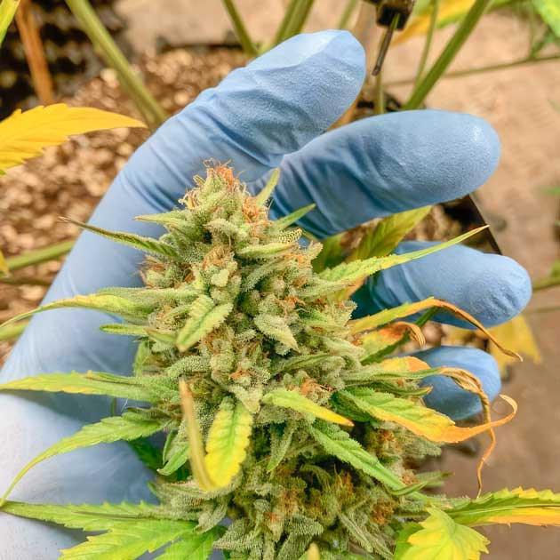 В процессе 9-й недели Vanilla Latte Auto стремительно переоделась в осенний костюм. Созревающий куст приобрел желтые и оранжевые краски. Листочки начали подсыхать, а проверка трихом показала, что урожай практически готов к сбору. В итоге харвест провел на 65-й день цикла.