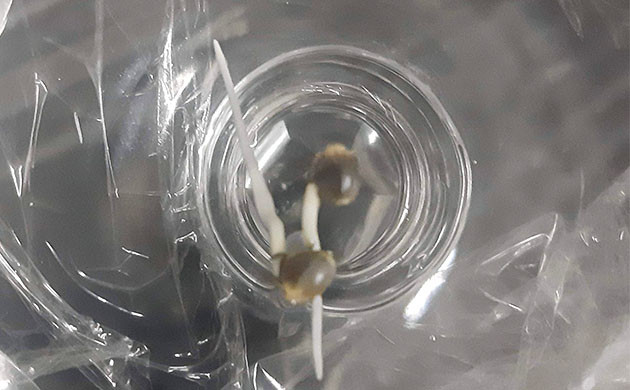 Проращивал семена в стакане с водой плюс несколько капель перекиси водорода. Они раскрылись и пустили корешки за 3 дня, после чего я отправил их в горшки по 0,6 л. Свет включен 18/6, лампа висит на расстоянии 50 сантиметров. Температура днем 24 °C, ночью опускается до 18 °C. Влажность – 75 %. Первую неделю поливал чистой водой с pH 6,0, стараясь не заливать саженцы. Никаких проблем, ростки пробили грунт, скинули каски и к концу недели сформировали первую пару листьев.