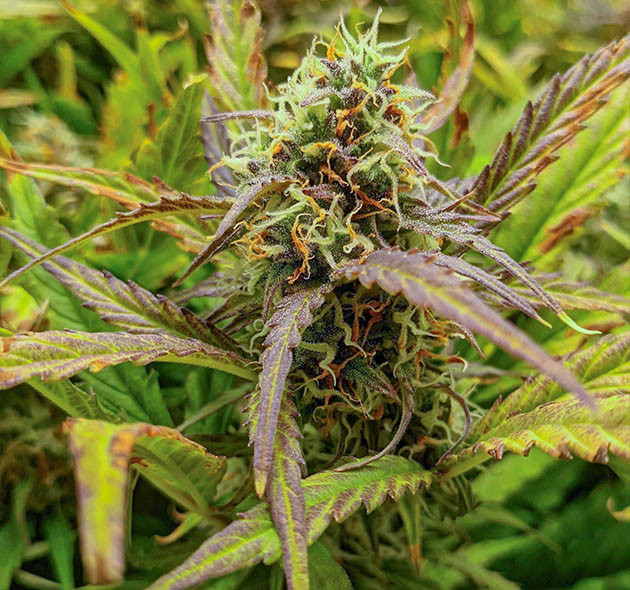 К концу девятой недели растишка перестала тянуться, и я решил снять сетку. Высота кроны составляла где-то 45 сантиметров. Куст продолжает много пить, но уже не в таком количестве, как во время первых недель цветения. Сахарная листва начала постепенно менять цвет. Много верхних листиков пострадало от светового ожога. Таким образом, на верхушках получилась разноцветная палитра из жёлто-коричнево-фиолетовых листьев. Волоски на шишках начали менять окрас на десятой неделе, но при осмотре трихом янтаря я пока не заметил.