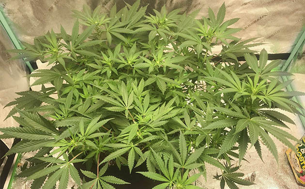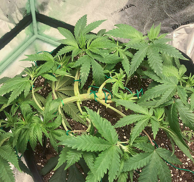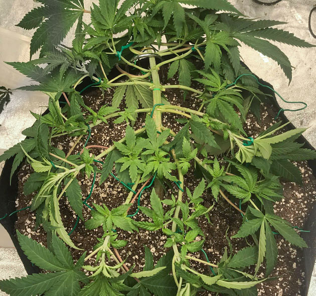 На третьей неделе я начал сомневаться, а фотопериодный ли мне достался сорт? Очень стремительное развитие, как у автоцвета. Доверившись Джа и тем, кто упаковывал семена, я принял решение начать тренировки. Итак, сначала я начал делать максимальное LST. Спустя три дня приступил к мейн-линингу. К концу недели передо мной был идеально плоский кустик, пышный и ветвистый, а основной стебель был невероятно толстым и крепким. За неделю растишка получила две порции чистой воды и порцию компота с All-Purpose Fertilizer. Лью по 2 литра, ей пока хватает такого количества, несмотря на большой объём горшка.