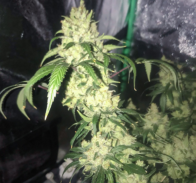 Еще три недели уверенного набора массы соцветий. За это время ветви еще немного вытянулись, но основной прогресс был заметен именно на шишках. Огромное количество сахара на листьях, много смолы и невероятный аромат. Очень ягодный тон, но с выраженными травянистыми оттенками. Моя работа с кустом практически окончена. Удалял листья, которые постепенно подсыхали и уже выполнили свою функцию. Что касается полива и подкормки, то график не изменялся на протяжении всего цикла. Схема питания так же состоит из двух компонентов в прежней концентрации.