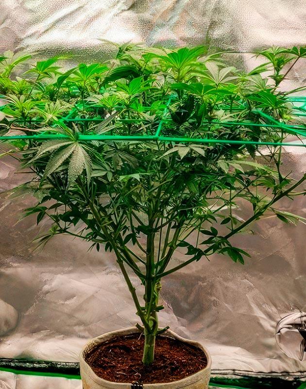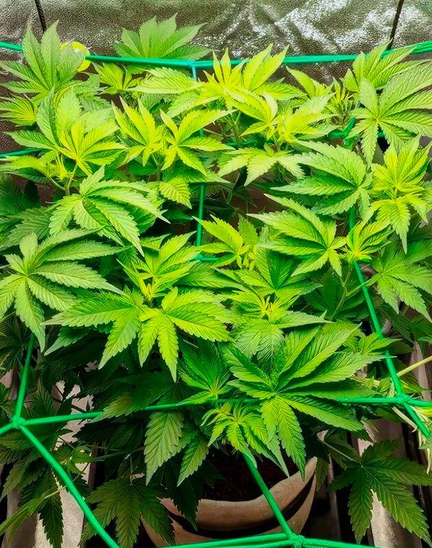 На этой неделе была проведена колоссальная работа. Я продолжил растягивать ветки в стороны при помощи колышков, а чтобы фиксировать их в горизонтальной плоскости, использовал сетку ScrOG. Также пришлось срезать несколько охапок крупных вееров, потому что они, словно зонты, закрывали нижние ярусы. Теперь куст выглядит куда более легко, а свет достает до самого горшка.