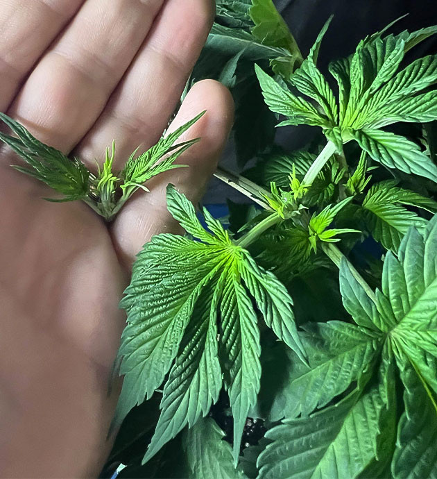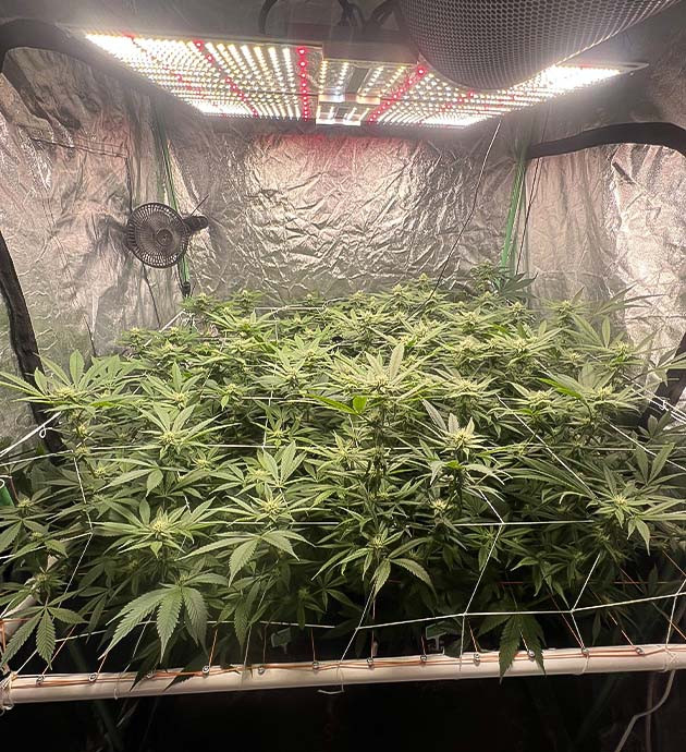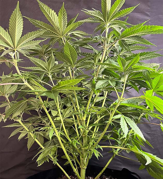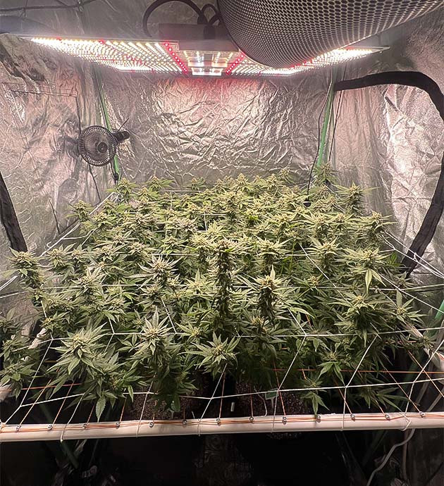 Итак, на седьмой неделе всё было готово к цвету. Но я был вынужден подождать еще немного, так как был сильно загружен бытовыми делами. Начал устанавливать сетки скрог и постепенно разводить колы по ячейкам, хоть времени у меня было и не особо много. По ходу убирал немного листвы на кустиках. Обычно делаю более обширную дефолиацию перед цветом, в этот раз решил оставить побольше зелени. К концу недели я закончил «настройку» ScrOG, все колы были разогнуты в отдельные ячейки, лишняя листва удалена, место для боковых ветвей предусмотрено. Кусты получили по две порции удобрений, 4 литра за один полив: