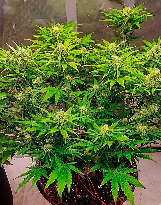 Цветение наступило неожиданно, и буквально за пару дней растишка сильно увеличилась в размерах, сформировав огромное количество листвы. Также я наблюдаю первые зачатки шишек, которые пока никак не пахнут. Мне пришлось прибегнуть к дефолиации, так как листьев стало слишком много. Кроме того, я начал добавлять в почву по 2 мл/л мелассы в качестве удобрений.