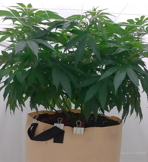 Спустя сутки Муня прогнула центральный стебель и типа подняла голову. Я передвинул зажим с резинкой по краю гроубэга ближе к ручке, тем самым увеличив силу натяжения, соответственно, растиха нагнулась ещё чуть ниже. На 16-й день пониже нагнул растиху и веточки нижние как бы вытащил на свет, подзаправив под них большие (относительно) листья, чтобы к свету тянулись и росли ветки. Пару дней спустя переставил резинку на этаж выше по централке, подогнул на грани фола. Резинку на зажиме сложил вдвое, ещё уменьшив её длину. Листья под отрастающие веточки заправил да сверху субстрат взрыхлил немного. К концу третьей недели нижние ветви прилично вытянулись, и я поставил зажимы с резинками для них. Полив сделал уже 2 литрами, состав добавляемых удобрений не менял, лишь пропорционально увеличил их количество: по 4 мл «Биобизз БиоХэвэн» и «Вуду Джуйс» + 2 мл «Карболоад». Получилось рН 6,2 и ppm 187.