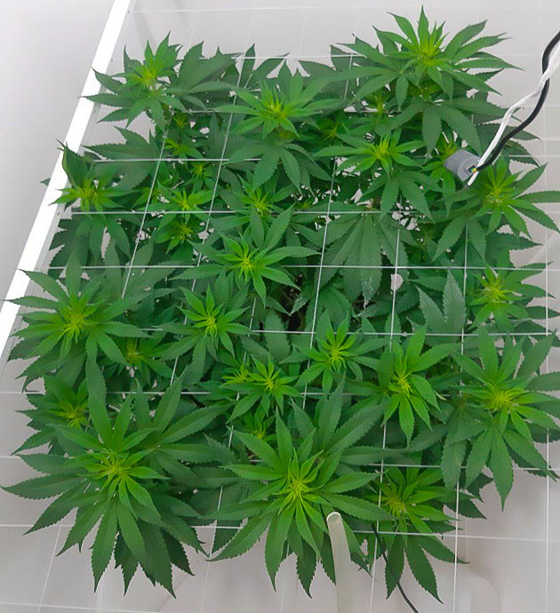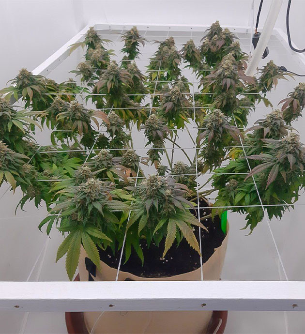 В начале недели немного поправил ветки под сеткой. На 58-й день сделал полив 3 литрами того же самого раствора на вегу в 100%-ной дозировке, что и в позапрошлый полив, рН 6,0 и ppm 1472. Спустя сутки опять немного подрастянул ветки. На 60-й день сделал большую дефолиацию. Фото до и после. После этого убрал все зажимы и резинки.