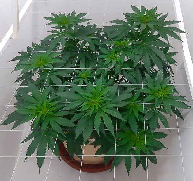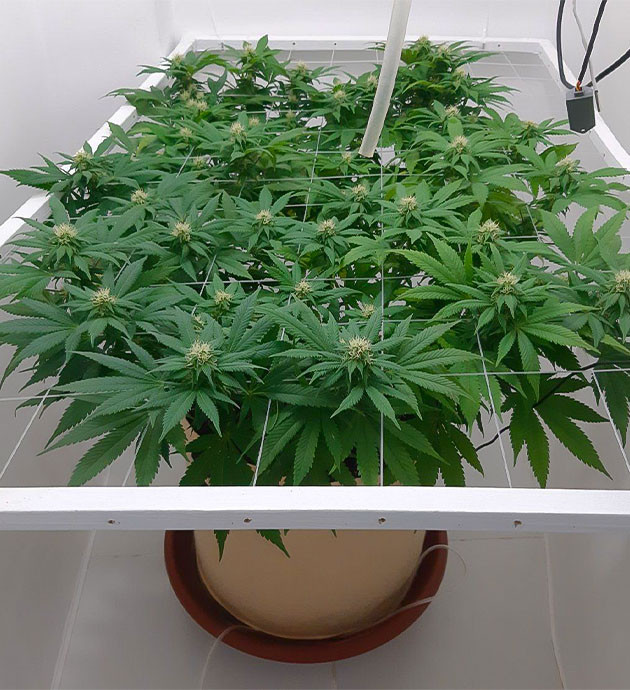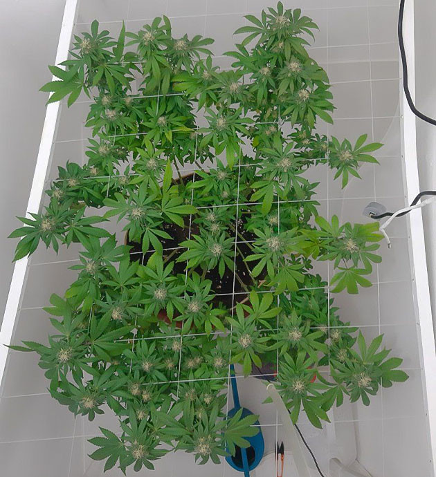 Поставил в бокс Муню и установил сетку. 37 дней от каски ей было в этот день. Над ней по-прежнему висит одна лампа Bestva. На данном этапе в боксе 59 % влажности и 23,4 °C. Сделал небольшую стрижку, убрал буквально несколько листков. На 40-й день был полив 3 литрами раствора на вегу, состав которого уже был выше, 100 % дозировки сделал и сверху добавил 3 мл «Биобизз БиоХэвэн» и 5 мл «Карболоад», рН раствора 6,2 и ppm 1250, в дренаж вытекло около 650 мл, в которых рН был 6,5 и ppm 1560. После этого еще немного постриг куст на нижних этажах.