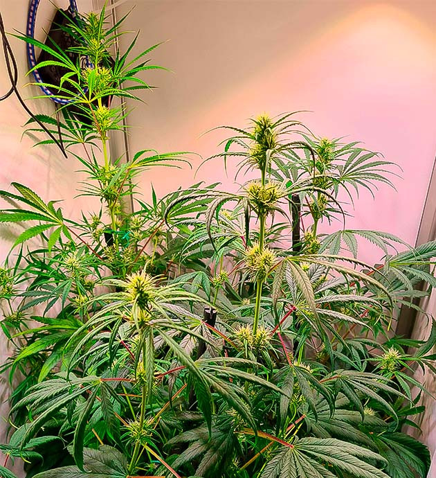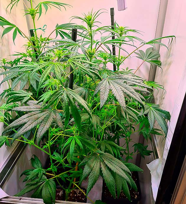 Цветение началось и идет хорошо. Листвы становится все больше, а соцветия постепенно формируются. На седьмой неделе пришлось прибегнуть к дефолиации и LST-подгибу. Растишки отлично перенесли тренировки, никаких признаков стресса я не наблюдаю. По высоте они уже вытянулись до 58 сантиметров.