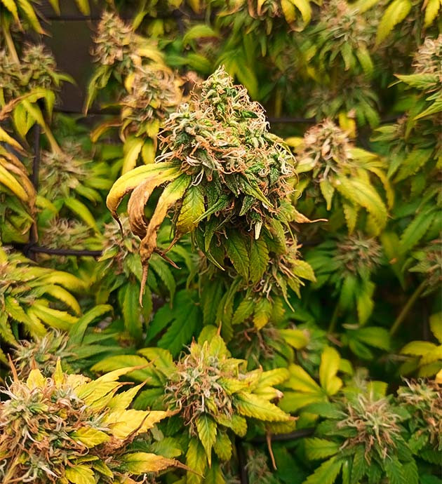 Следующие две недели были довольно напряженными. Растиха начала стрессовать из-за высокой температуры, также решил снизить концентрацию удобрений. На 15-й неделе листва начала обвисать и стремительно желтеть. Пестики на шишках на 75 % оранжевые, трихомы молочные и немного янтаря.