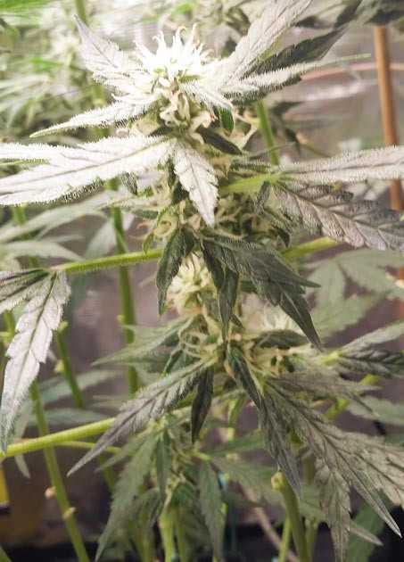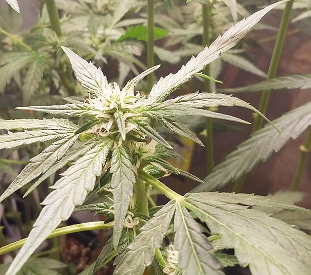 Кустик будто услышал моё недовольство и решил поторопиться. Трихомы начали наливаться янтарём, причем так быстро, что уже к середине недели я подумывал делать экстренный харвест. С начала недели лил чистую воду без удобрений. Может, это так ускорило процесс созревания? Как бы там ни было, куст я зарубил на 90-й день от каски.