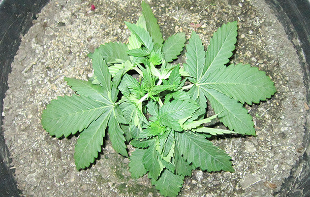 На 2-й день пятой недели от каски свет переведен на режим 12/12. Хорошенько подстриг листву, проредил куст процентов на 40-50, но оставил часть нижних лопухов. Поливал раз в два дня по 2 литра со слабой концентрацией буйских (5 мл/л). Растиха быстро пришла в себя от дефолиации и начала стрелять в рост.