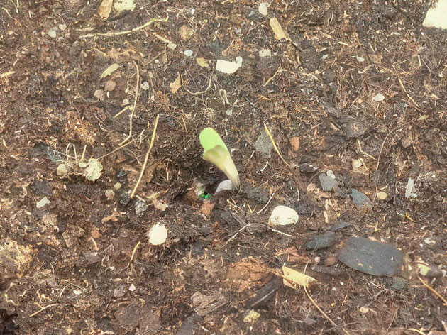 Отталкиваясь от моего основного принципа, проращивал семечку я также непосредственно в почве. На прорастание ушло около четырех дней, а еще за три дня кустик уже перешел к вегетативному росту и набору первых пар листьев.