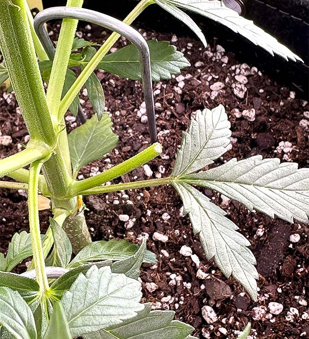 На пятой неделе я по своей неосторожности сломал нижнюю ветку, которая росла из узла с первым лопухом. Сделал это, когда подсыпал почвы в горшок. Решил не мучить кустик и просто обрезал веточку в месте перелома. Несмотря на этот казус, на 30-й день начал делать LST. На 32-й полил компостным чаем от Recharge. Затем сделал еще один фимминг, а на одной макухе – топпинг. 34-й день, подкормка, 2 литра: