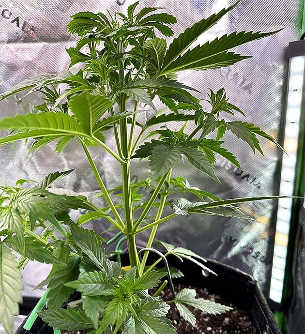 В начале третьей недели (15-й день) полил во второй раз, теперь до дренажа, вошло чуть меньше литра. На 17-й день опустил свет до 45 сантиметров и включил его на 70 % мощности. Температура 26 °C, влажность 70 %, VPD 1.0. Еще один полив на 19-й день, а затем еще немного на 20-й, чтобы подготовить саженец к пересадке. На 21-й день пересадил кустик в тканевый горшок на 12 литров, на бордах включил режим «вега» на 80 % мощности, расстояние до горшка – 50 сантиметров.