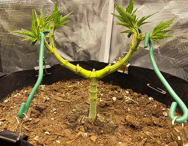 Второй росток, к сожалению, погиб. Считаю, что все-таки проблема заключалась в излишке питательных веществ. Поэтому для перестраховки я еще раз пересадил первый росток в еще больший горшок. Помимо этого, я подрезал верхушку, а также прибегнул к реализации техники мейн лининга. Высота растишки на данном этапе составляла 16 сантиметров.