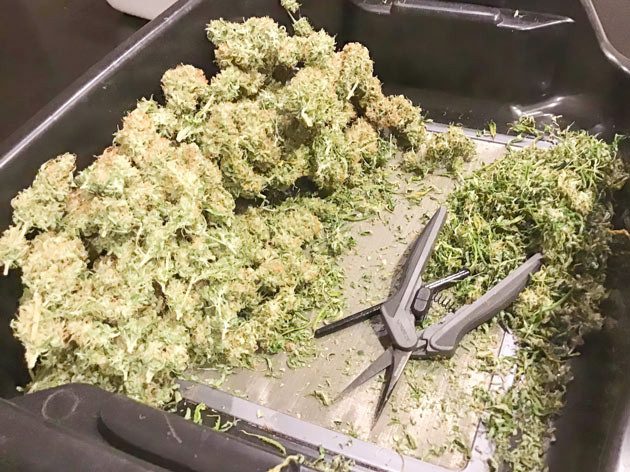Разделил куст на несколько больших веток, частично проманикюрил, удалив в основном только лопухи, и развесил сушиться. До оптимального состояния перед пролечкой они высохли за 8 дней при темпе в 25 °C, влажности 50 % и постоянно работающем обдуве. После этого тщательный маникюр, шишки в одну сторону, трим – в другую. Итоговое количество бошек, которые отправились лечиться, – 102 грамма. Плюс нехило так трима, но его я вешать не стал.