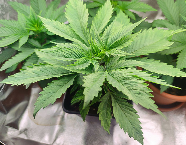 За вторую неделю «Горилла» продемонстрировала удивительную прибавку в росте. Такое чувство, что она одновременно и корни нарастила, и надземную часть куста. К концу недели рост кустика уже был 20 сантиметров. Он даже на фоне других моих растений был больше и пышнее. Решил приспустить лампу до 20 сантиметров, чтобы растиха так сильно не тянулась, иначе она разорвёт палатку. Поливал два раза по 200 мл, кустику вроде бы достаточно.