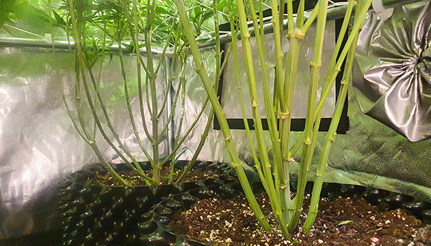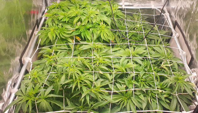В начале пятой недели я сделал топпинг, немного согнул кустики и натянул сетку ScrOG. Очень доволен тем, какая получилась крона. Причем растихи стоят плотно друг к другу, прилично разрослись в ширину, и поэтому крона получилась практически однородной. Растения быстро восстановились от топпинга и продолжили расти. До сетки оставалось всего несколько сантиметров. Несмотря на то, что цветение еще не началось, в боксе уже появился запах.