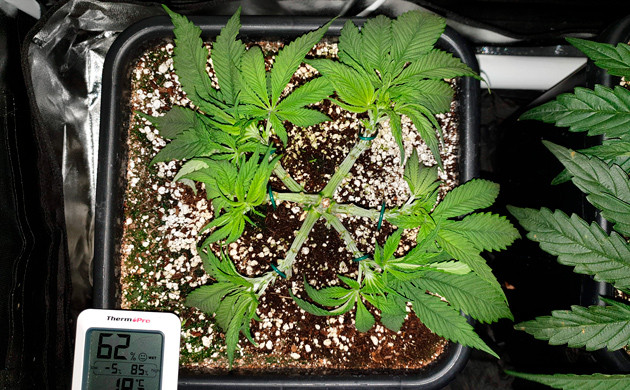 Две недели я дал кустику спокойно развиваться и восстанавливаться, набрать зеленую массу и подготовиться к переводу в цвет. Убрал подвязки LST, чтобы куст немного подрос вверх. Поливаю и кормлю по прежней схеме.