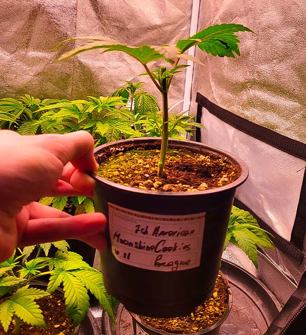 На восьмой неделе жизни растение было переведено на короткий световой день и питательные вещества для стимуляции цветения. Всю неделю наблюдалась хорошая динамика. Moonshine Cookies оказался самым высоким из своих собратьев. Куст имеет жесткий каркас из толстых крепких стеблей. Запаха пока что нет, но если потереть листочки или стебель, то можно почувствовать на пальцах приятный цитрусовый аромат, напоминающий мандариновую мякоть.