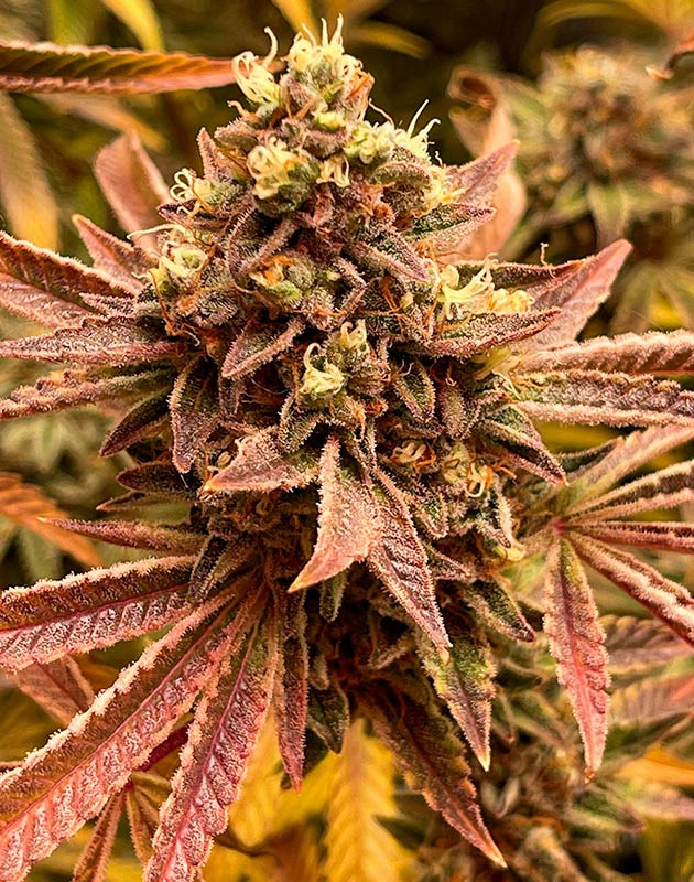 Учитывая обожженные удобрениями части куста, я начал постепенно удалять все больше и больше листвы. Таким образом, растение направит свой финальный рывок на соцветия, да и работать с кустом на харвесте будет проще. Хочу отметить, что в палатке не слишком сильный запах, несмотря на монструозный вид растения и огромное количество бутонов. Куст очень интересного цвета, фиолетово-красно-розового. Такого изменения цвета можно добиться не только ожогом удобрениями, но и значительными перепадами температур. Напомню, разница между днем и ночью составляет 12 градусов. С 20-й недели куст начал также получать Stimulator Super Boost PK в количестве 1 мл/л.