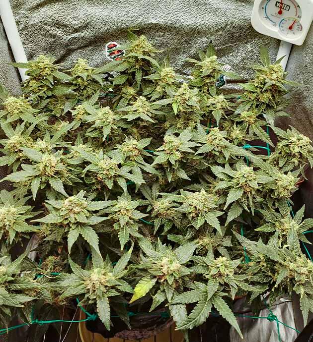 Кустик занял практически все места в сетке, но продолжает расти, а я продолжаю его бережно заплетать. Сейчас появился уже довольно сильный запах классической марихуаны, который ни с чем не спутаешь. Стараюсь поливать с открытой дверцей быстрее, чтобы не привлекать внимание кота или, не дай бог, соседей. Поэтому без фильтра поднимать этот сорт не рекомендую точно.