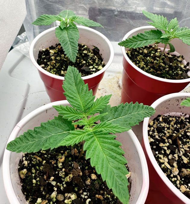 Вторая неделя прошла без особых изменений, кроме появления второй пары листьев. А на третьей я осуществил пересадку в тканевые горшки на 11 литров. Растения выглядят великолепно и пока достаточно однородны. По высоте они уже достигли отметки в 15 сантиметров. Также я начал давать им удобрения на 2 литра воды: