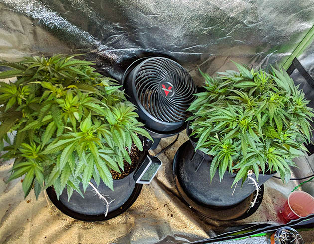 На второй неделе я заменил лампу на Mars ll 1600 и решил дать растениям 50%-ную дозу удобрений от указанной производителем. Использовал компот с G.O. Thrive Grow, CaMg+, G.H.Roots, G.O. Seaweed. К моему разочарованию, они очень быстро отреагировали на подкормку, но совсем не так, как я ожидал. На листиках начали появляться признаки перекорма, поэтому я их быстро промыл чистой отстоянной водой с pH 6,5. От промывки листья также пострадали и начали скручиваться из-за перелива. А еще из-за того, что вентиляция и вентилятор пока не работали, в боксе было очень жарко, доходило до 35 градусов. В общем, как выжили мои саженцы, одному Джа известно. Но они справились, я включил вентиляцию, обдув и выровнял их состояние.