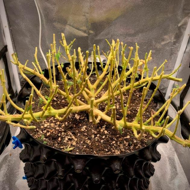 На 18-й день куст был обезглавлен. Пару дней дал ему прийти в себя, а потом убрал лопухи и начал гнуть. Наблюдая за тем, как растение реагирует на манипуляции, становится ясно, что с генами очень повезло. Идем без стрессов и тормозов. А еще по-прежнему без кормежки, только «Циркон» и янтарка раз в неделю по листу.