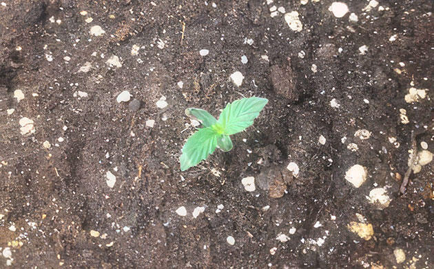 На 9-й день цикла, или 2-й день второй недели, был первый полив литром воды с рН 6,1. Также я решил немного взрыхлить грунт. 11-й день цикла, еще 500 мл воды и по листу «Эпин». Кустик уже выпустил первые боковые лапки. Это настоящий монстр, только пока еще маленький.