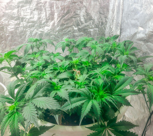 Я вернулся к 18-му дню цикла, а там уже реально куст, который я еще веревочками растянул и подогнул. Да, кстати, днем в боксе 26 градусов, и растению, кажется, все очень нравится.