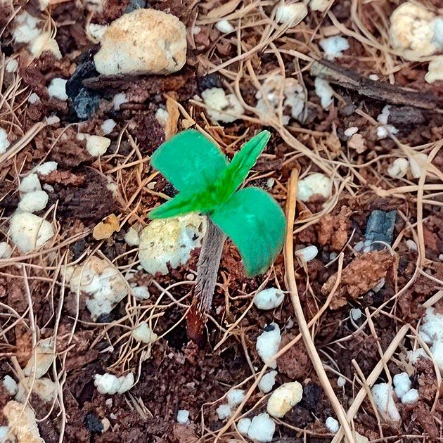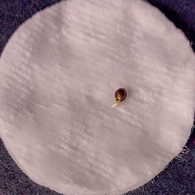 Начну свой рассказ с этапа проращивания. Я поместил семечко в стакан с водой и оставил его там на сутки. За 24 часа оно напиталось влагой и опустилось на дно емкости, что уже являлось хорошим сигналом. После водной ванны положил зерно между двумя влажными ватными дисками и оставил прорастать в небольшом пищевом контейнере. Уже на следующий день семечко раскрылось и показало аккуратный белый корешочек, поэтому я сразу пересадил его в подготовленный 11-литровый гроубэг. Субстрат – смесь кокоса и перлита (где-то 70 : 30), которую заранее заправил гранулами Grow Dots.