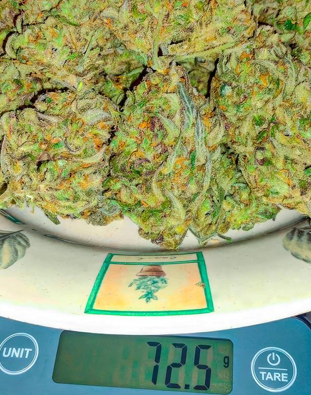 Сбор урожая не отнял много времени. Я просто разделил куст на ветки, убрал оставшиеся веерные листочки и подвесил сушиться в том же боксе под потолком вниз головой, слегка уменьшив поток воздуха и поддерживая стабильный климат. За неделю с небольшим шишки подсохли до нужной степени, и у меня на руках очутилось 72,5 грамма идеального продукта и еще где-то грамм 40 тримма и попкорна, из которых планирую сделать канна-масло. Сырья там хватит на приличную партию.