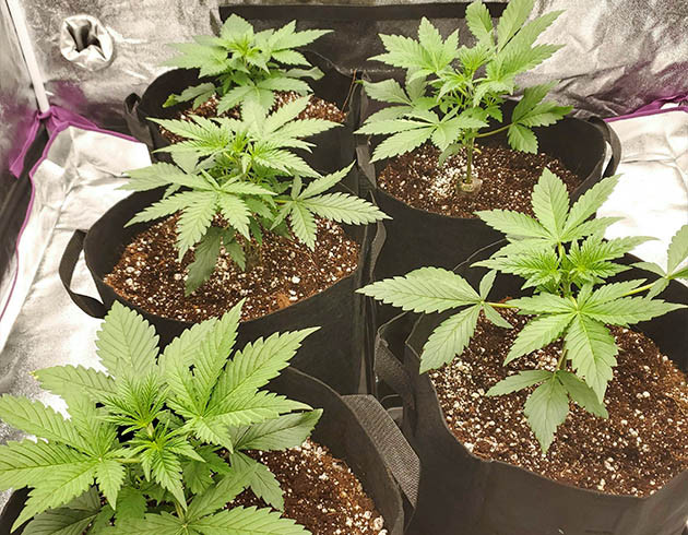 На 12-й день от каски растишки были пересажены в горшки и отправились в гроубокс. Там стоит еще пара уже дозревающих кустов, но скоро они будут срублены, и палатка будет полностью в распоряжении Super Lemon Haze. Теперь световой режим 18/6, до лампы 50+ см. После пересадки кустики не показали особого стресса и получили первую порцию удобрений: