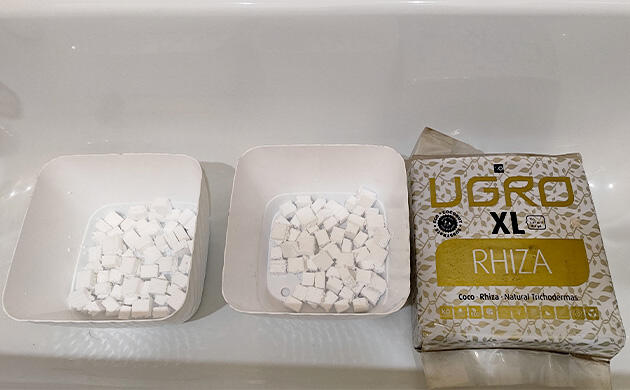 Проращиваю в контейнере между губок, которые тупо смочил водой из-под крана. Горшки 2 по 15 л, решил срезать верх, теперь рабочее расстояние от лампы до субстрата 40 см. В качестве дренажа нарезал пенопласта, он инертный и не подвержен плесени. Кокосовый субстрат Ugro с микоризой и триходермой. На оба горшка ушло 1,25 кг.