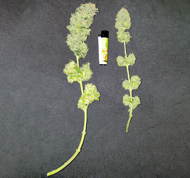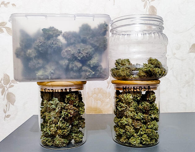 Радует, что удалось победить «Гориллу» в ограниченном пространстве. Девочка выдала на удивление жирный липкий урожай, думал, будет рыхлее. Не рекомендую в мелком боксе (либо ваши руки не для скуки). «Мимоза» порадовала красотой и структурой шишки. По сути, её можно было резать раньше, но решил дать ей чуть янтаря. В количестве кол нет смысла, 8-10 достаточно. Нужное количество шишек все равно нарастет при должном уходе.