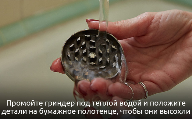 Тщательно промойте гриндер под проточной теплой водой и положите детали на бумажное полотенце, чтобы они высохли.