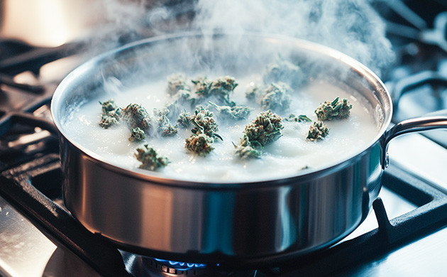 3. Добавьте декарбоксилированные шишки в масло и варите на протяжении 2-3 часов, периодически помешивая, чтобы ничего не пригорело.
