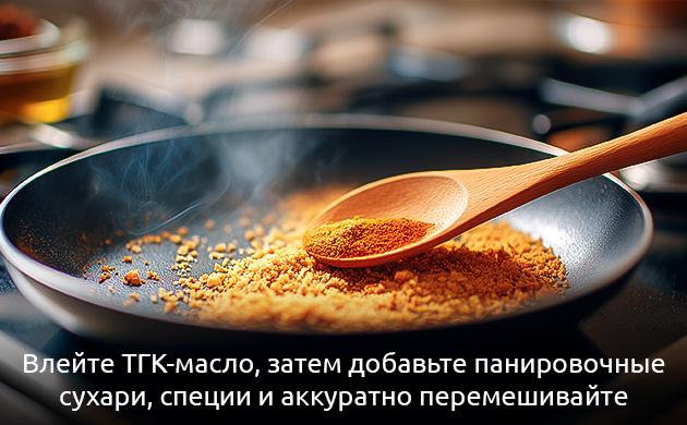 Разогрейте небольшую сковородку на среднем огне. Влейте ТГК-масло, дайте ему прогреться, затем добавьте панировочные сухари, специи и аккуратно перемешивайте деревянной ложкой. Обжаривайте в течение 2-3 минут, пока крошка не станет румяной и хрустящей, но не пережаренной. Она должна пахнуть восхитительно. Остудите и держите до момента сервировки.
