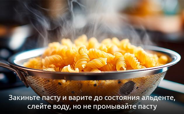 Не переваривайте макароны. Макароны альденте сохраняют текстуру и не превращаются в кашу после смешивания с соусом. Они ещё немного дойдут в горячем соусе и останутся плотными и аппетитными на вкус.