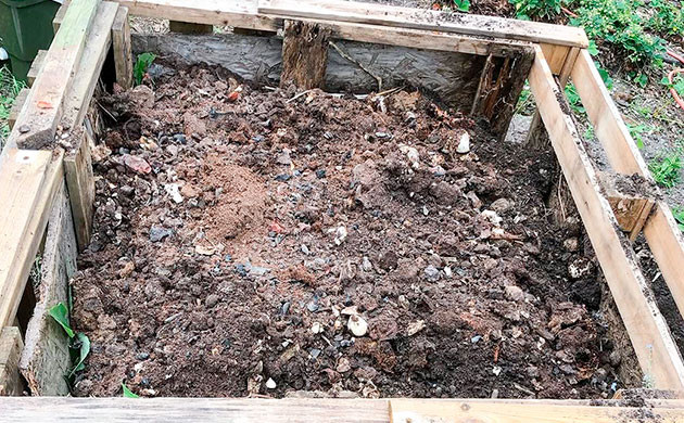 • Смешайте отходы разного вида. Соедините «зеленые» материалы (кухонные отходы, скошенную траву) и «коричневые» материалы (сухие листья, картон) в сбалансированном соотношении 2 : 1. Кучи должны быть размером 1 х 1 х 1 м, чтобы температура внутри достигала 80 градусов Цельсия. Это обеспечит уничтожение патогенных микроорганизмов и наиболее быстрое разрушение растительного материала.