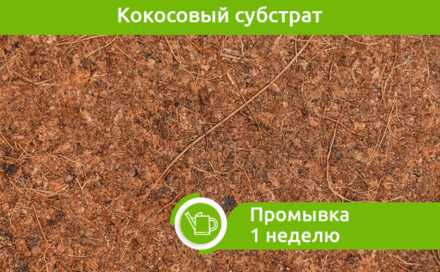 • Кокосовый субстрат промывается в течение недели. За это время растения пару раз проливаются чистой водой, и все излишки химических солей выводятся из субстрата.