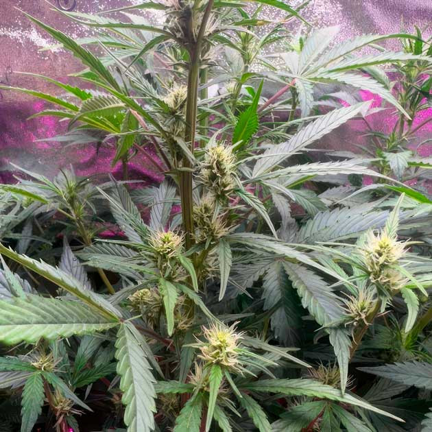 Кусты у потолка, особенно правый и центральный. Высота 101 см. Пришлось снова поднять свет, чтобы избежать ожогов. Колы начали переходить в финальную стадию созревания, пестики начинают менять цвет, ветви украшены уже достаточно плотными шишками. Центральный куст стал источником самого насыщенного аромата: сладкая ягода с намёком на сироп и бензин. У Ранта тоже на удивление мощные шишки, хотя он и компактнее остальных.