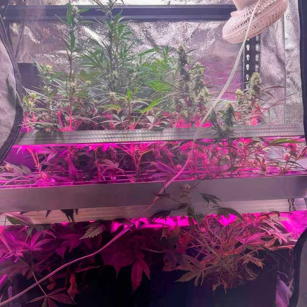 Кусты наконец-то не вытягиваются вверх, заняты наращиванием массы. Самые пушистые соцветия у правого куста. Появились первые янтарные трихомы, причем не на шишках, а на сахарных листьях. Центральный куст почти вплотную к свету, пришлось в очередной раз подогнуть и подвязать. Аромат вышел на новый уровень, яркая смесь ежевики и травянистого сиропа, особенно с утра.