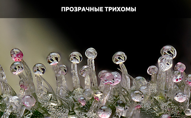 Контролируя изменение цвета головок трихом, гровер может оценить степень зрелости урожая. От начала цветения и до его середины смоляные головки будут преимущественно прозрачными. В то же время ближе к окончанию фазы трихомы будут мутнеть, приобретая молочно-белый оттенок. На поздних этапах созревания они становятся янтарными.
