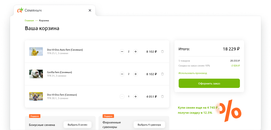 Перейти к акции и получить бонус Выберите два любых семени из списка бонусных, имеющихся в наличии.