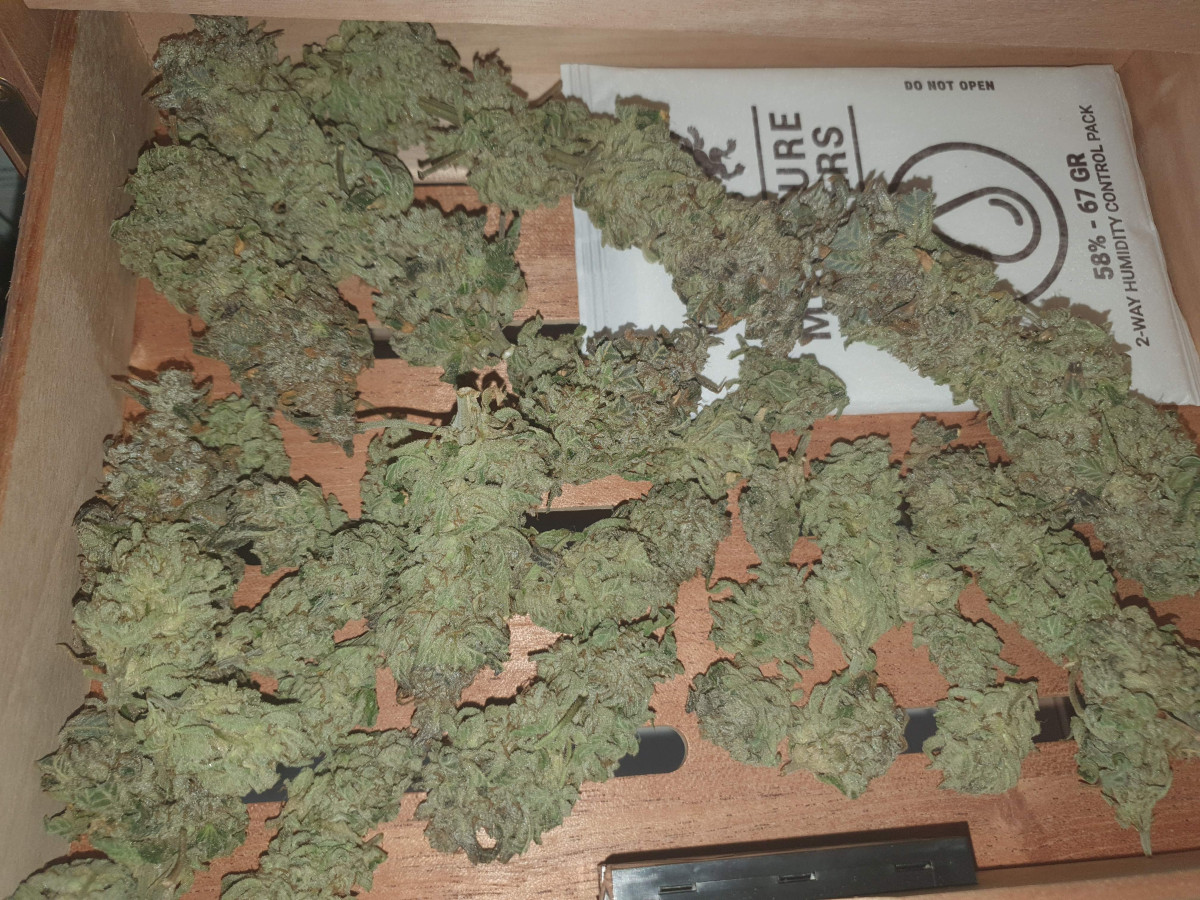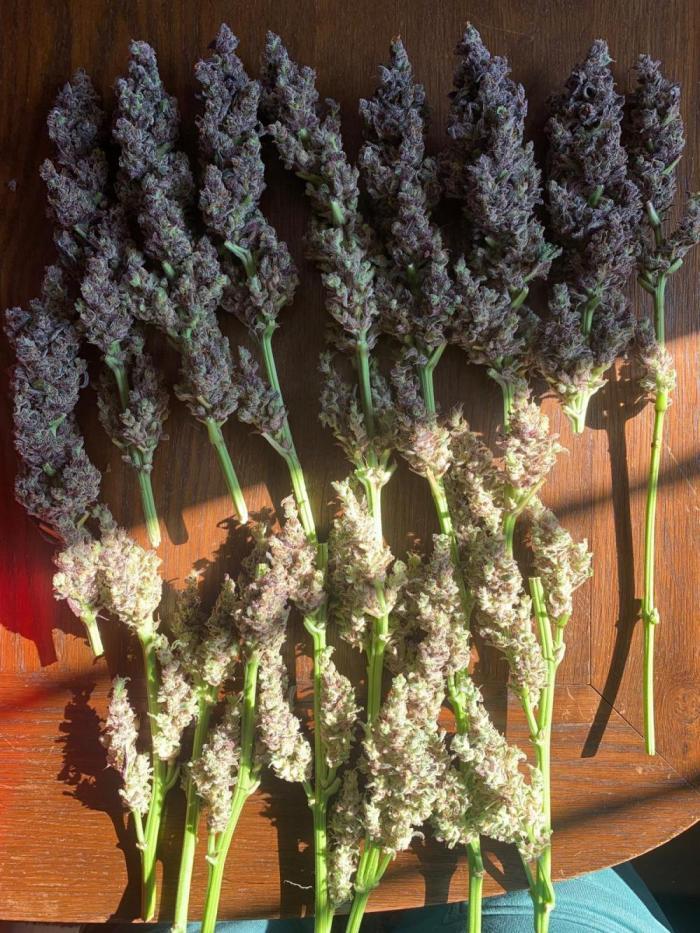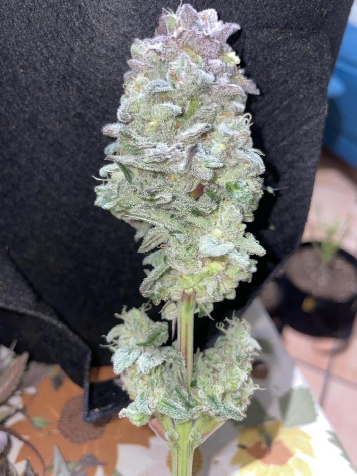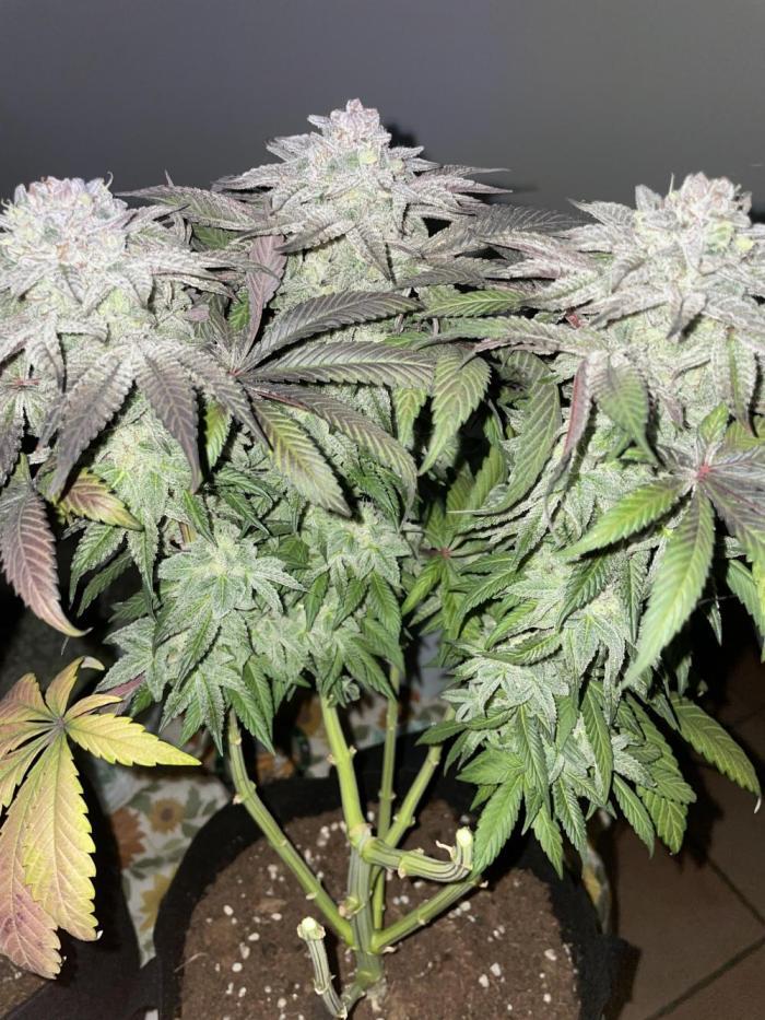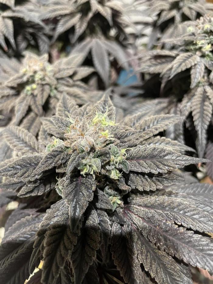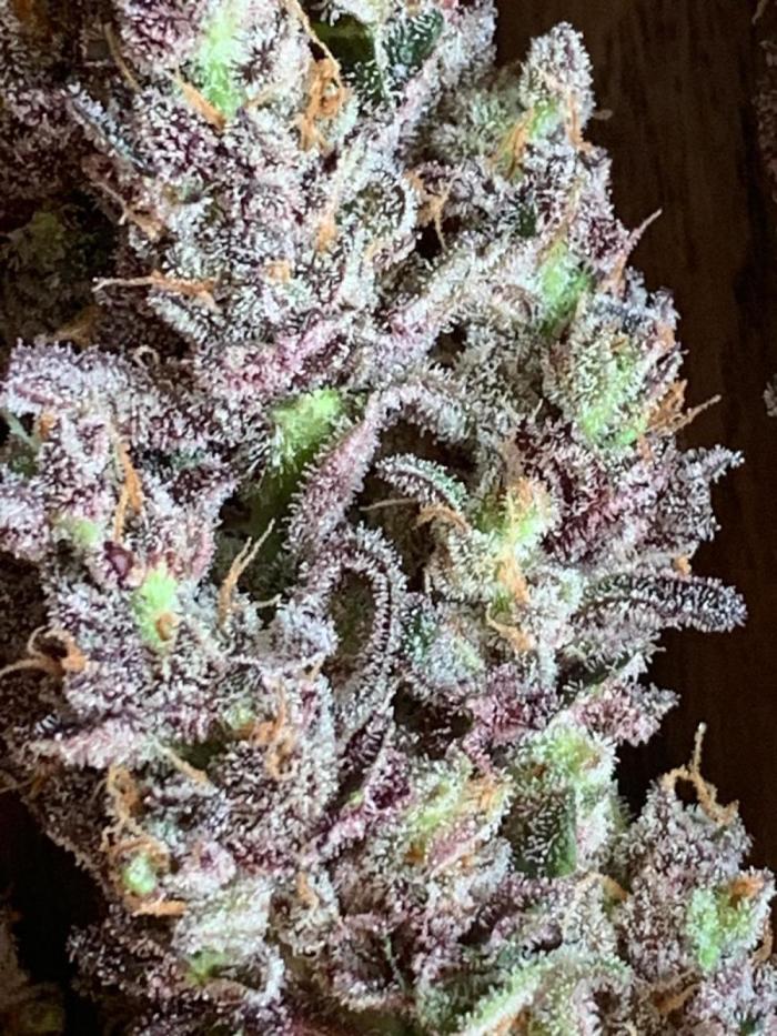 Покрытие трихомами было эпическим, и некоторые веерные листья были почти полностью ими покрыты, чего раньше никогда не случалось. Шишки среднего размера и твердые как камень. В последние дни перед харвестом у растения словно немного выцвел темно-фиолетовый цвет. Запах был землистым, древесным и кушевым.